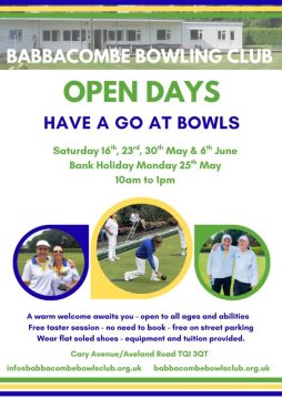 Welcome to Babbacombe Bowling Club.Our club is open early April to the end of September for outdoor bowling. You will certainly be greeted with a warm friendly welcome, whether to play, have a taster of bowling (as there is usually help at hand every Monday, Tuesday and Friday mornings) or as a spectator.We have many touring teams visit us throughout the season and our Fixture Secretary is more than happy to accommodate your club.We are in the beautiful area of Babbacombe, with many amenities nearby. Cafes, restaurants, spectacular views across Lyme Bay and easy access to Torquay.We are fortunate to have free roadside parking on roads around the club plus a good selection of hotels nearby.We would be delighted to see you and meet you in person and thank you for browsing through our website which I hope has been of interest to you.Thank you.